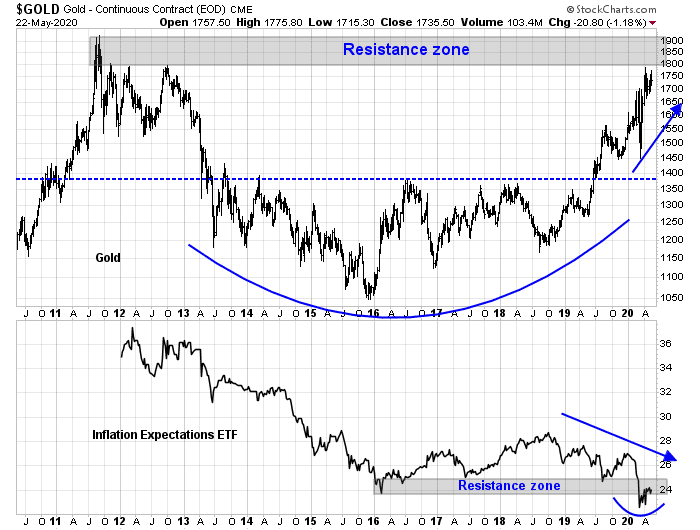 Forget gold as an inflation hedge. The chart below shows that gold staged an upside breakout in 2018 out of a multi-year base that stretches back to 2013. The price is now approaching a resistance zone, as defined by its all-time high. By contrast, the bond market inflationary expectation ETF (RINF) has been in a downtrend since late 2018. While inflationary expectations have begun to tick up, RINF is just approaching and testing a resistance zone.