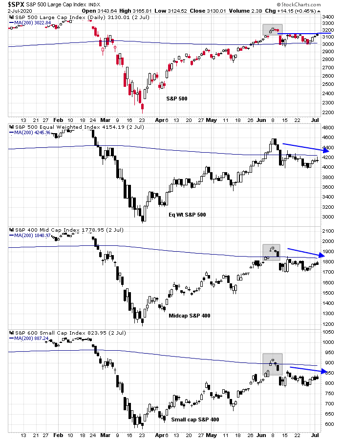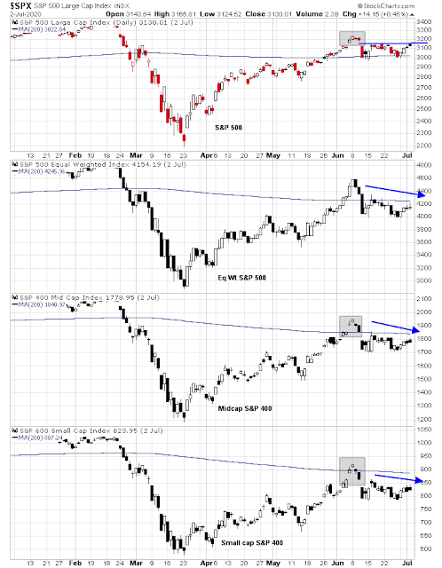 If we were to move beyond the NASDAQ leaders, the chart patterns of mid and small cap stocks are cause for concern. The chart below shows the S&P 500, the equal-weighted S&P 500, the Midcap S&P 400, and the Small cap S&P 600. Three interesting patterns emerge from this analysis.