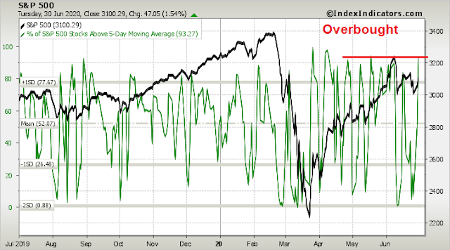 Short term breadth is overbought and the market is due for a pullback. The confluence of bearish intermediate term internals and overbought readings argue for a range-bound market, where we are at the top of the range.