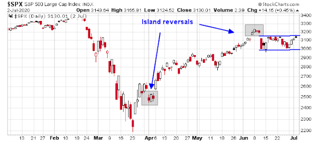 There is also a bullish island reversal in early April at around S&P 500 2550. This is now an open gap that hasn’t been filled.