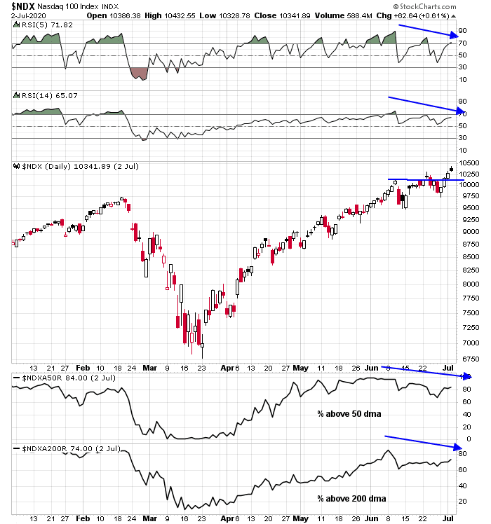 The intermediate term internals continue to tilt bearishly. Let’s begin with the NASDAQ, which achieved all-time highs on Thursday. However, the fresh highs were accompanied by negative 5 and 14 day RSI divergences, as well as negative divergences from the percentage of NASDAQ 100 stocks above their 50 and 200 day moving averages. That said, these negative divergences are not necessarily actionable trading signals, as they can persist for some time before the market turns down. What they do show is that the intermediate term outlook is not favorable for the bulls.