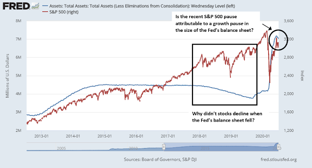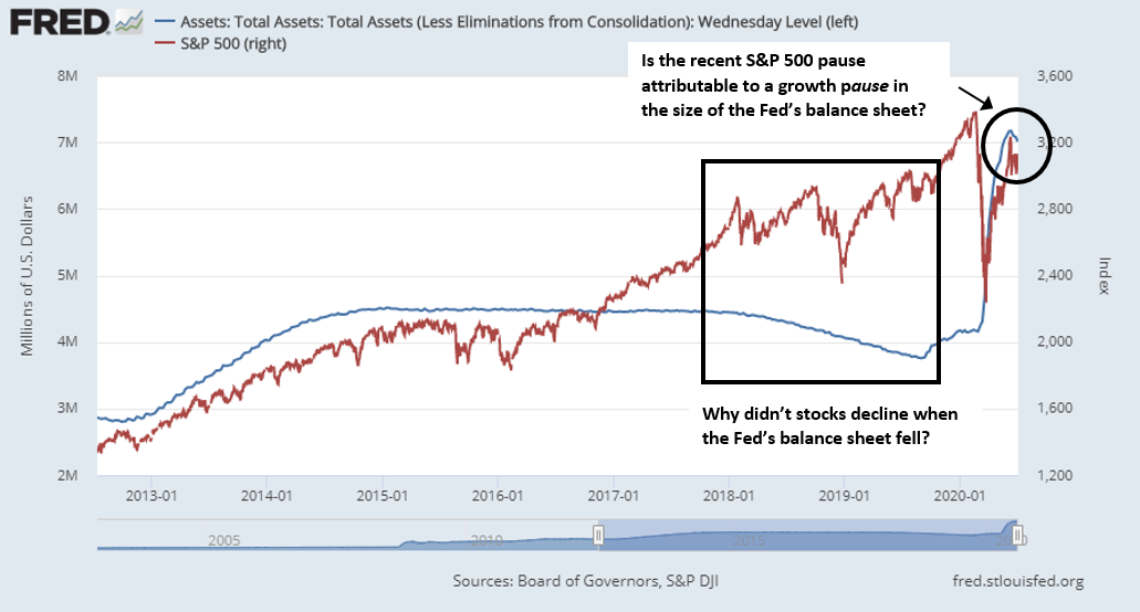 There has been an apparent near-term correlation between stock prices and the size of the Fed’s balance sheet. Arguably, the recent stall in the market can be explained by a rollover in balance sheet size. On the other hand, the size of the Fed’s balance sheet had flattened and began to fall in 2017, and stock prices continued to rise.