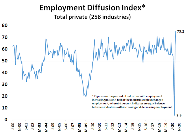 Let’s begin by analyzing the June Employment Report. The economy added 4.8 million jobs, which was well ahead of expectations. In addition, the diffusion index spiked, indicating a broad rebound. That’s good news.