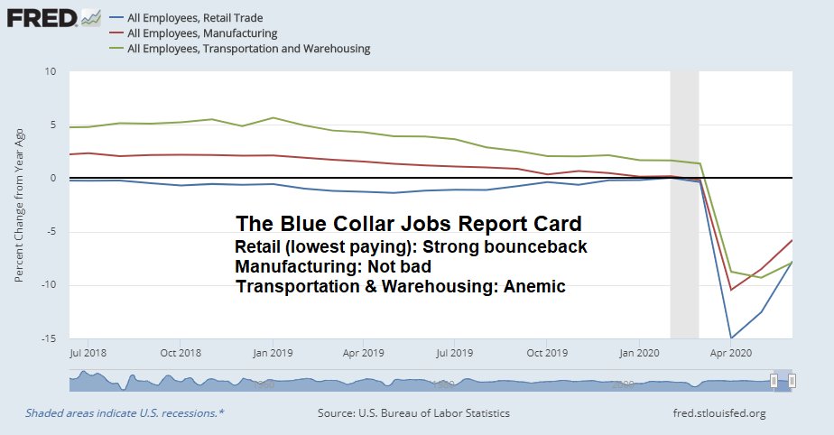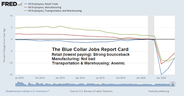 The story is the same within the blue and pink collar job sector. Low paying retail jobs have bounced back nicely. The rebound in high paying manufacturing jobs has been less strong, and transportation and warehousing job growth is stagnant.
