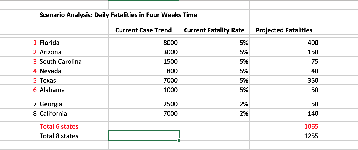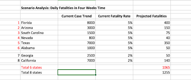 The death rate has not risen for now. If the lagged sequence of case count, hospitalization, and death were to hold, the daily fatality rate in the key states is expected to rise to 1,000 per day or more by late July.