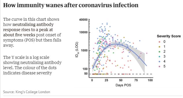 In the first longitudinal study of its kind, scientists analysed the immune response of more than 90 patients and healthcare workers at Guy’s and St Thomas’ NHS foundation trust and found levels of antibodies that can destroy the virus peaked about three weeks after the onset of symptoms then swiftly declined.