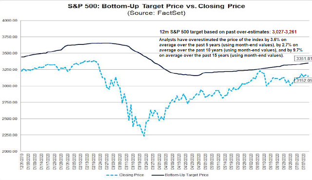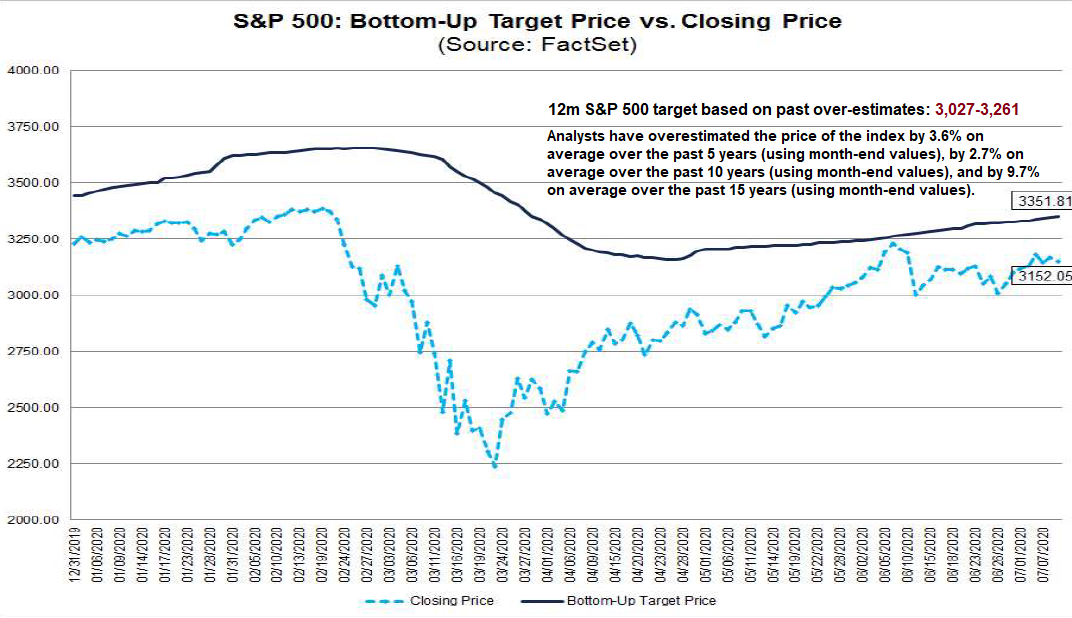 As well, FactSet calculates a bottom-up aggregated target price. The 12-month target is 3,352. Historically, analysts have over-estimated the actual prices by 3.6% in the last 5 years, by an average of 2.7% in the 10 years, and by 9.7% in the last 15 years. This makes the 12-month target range 3,027 to 3,261, which represents very little upside potential from current levels.