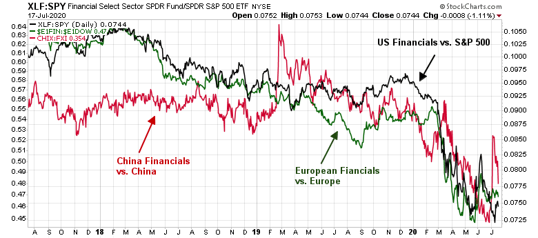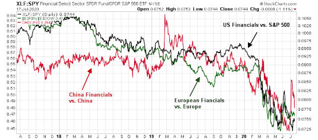 Financial stocks have lagged the market, not just in the US, but globally. The relative performance of this sector has been synchronized globally in the last two years. Even in China, banking stocks staged a relative rally when the Chinese market surged, but their relative returns have retreated as the market cooled off.