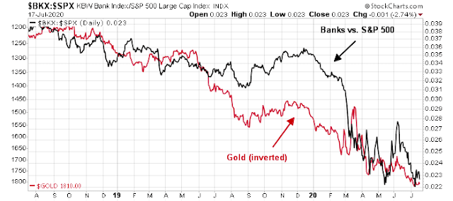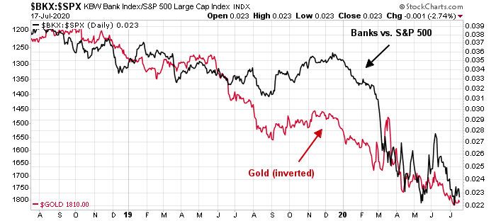 We also have a real-time price signal for the degree of financial repression. The price of gold responds to real interest rates. If the Fed were to artificially push down real rates, it puts upward pressure on gold. As the following chart shows, the relative performance of bank stocks are inversely correlated to gold.