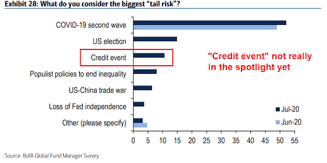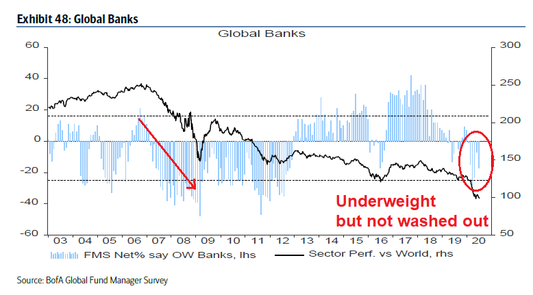 I would argue that this sector has not seen the capitulation event needed for a turnaround. In the past, periods of financial stress has been associated with banking crises. We have not had the credit event that sparks a banking crisis just yet. The latest BoA Global Fund Manager Survey shows that investors are overly focused on the COVID-19 Crisis, and the risk of a credit event is barely in the spotlight.