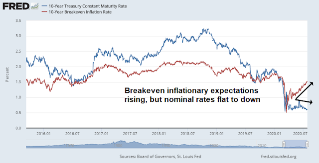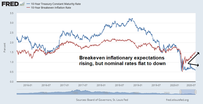 The Fed’s dovish tone is a statement of policy that it intends to keep rates low until employment returns to pre-pandemic levels. As well, it has not ruled out yield curve control to suppress rates in longer Treasury maturities. Real yields are falling as a consequence, and real yields (blue line) have been inversely correlated with gold prices (red line, inverted scale).