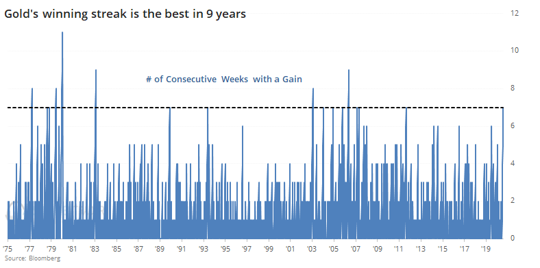 To be sure, gold sentiment is at an off-the-charts bullish extreme, which is contrarian bearish. SentimenTrader pointed out that the current rally represents a seven week winning streak for the shiny metal. “Outside of the late 1970’s run-up, every single signal showed a loss over the next month. Only one of them showed a gain even three months later.”