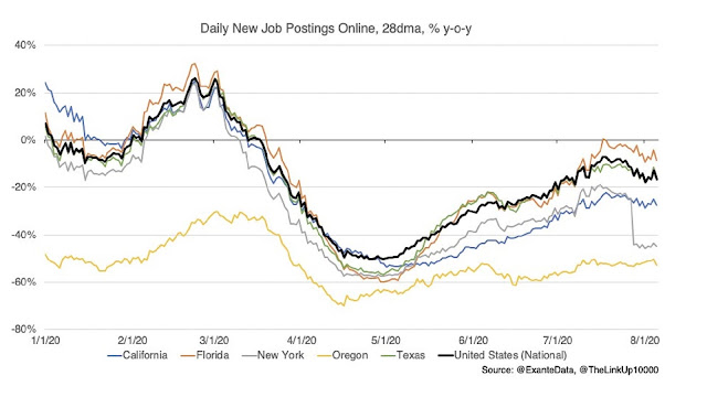More crucial to the growth outlook, here is the Memorandum to extend the supplemental unemployment insurance payments by $400 per week, down from the now expired $600 per week. The Trump Administration “declared an emergency” and raided the FEMA budget of $50 billion to pay for the extension. The measures were problematical in a number of way. First, state governors cannot pay the extra unemployment insurance without spending authorization from Congress, which the Memorandum does not. As well, under the law that governs FEMA, if the federal government declares a disaster, the state will have to request aid and pay 25% of the cost. It is unclear how many states would actually implement such a measure, and many states do not have the budget for the extra $100 per week. Even Ohio’s Republican governor Mike DeWine has expressed doubts about whether his state could participate in the program.