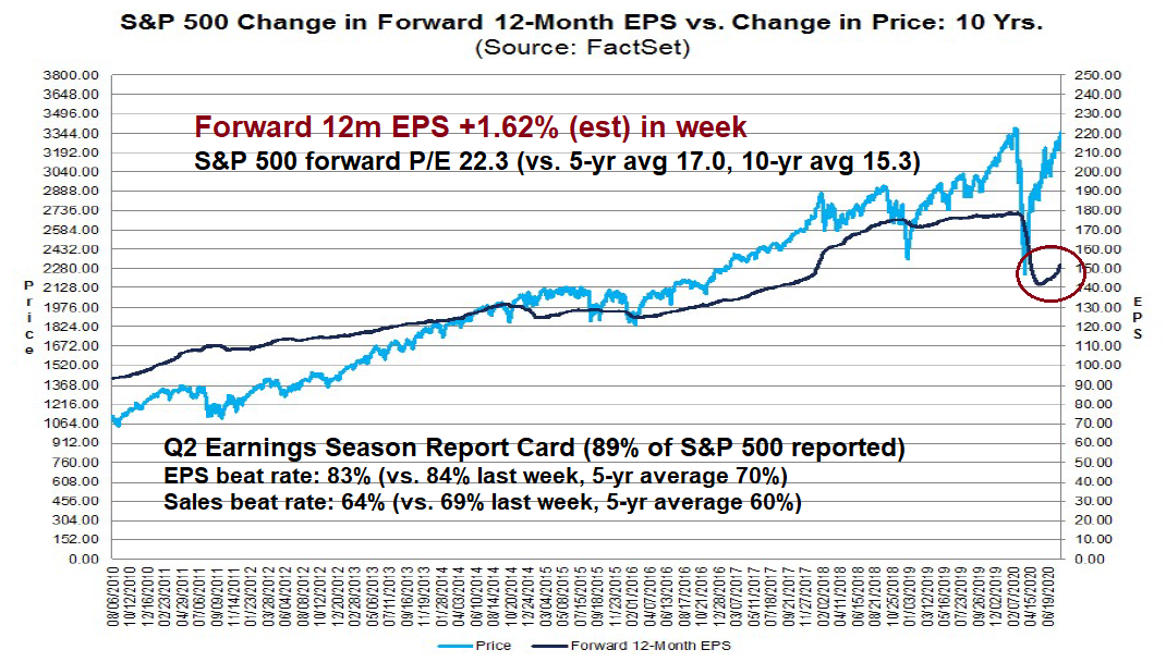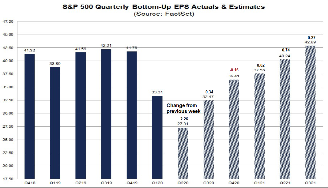 Company earnings guidance continues to be positive. FactSet reports that “11 [companies] have issued negative EPS guidance and 34 have issued positive EPS guidance. The percentage of companies issuing negative EPS guidance is 24% (11 out of 45), which is well below the 5-year average of 69%.” However, over half of the companies have withdrawn guidance, citing pandemic-related uncertainty.