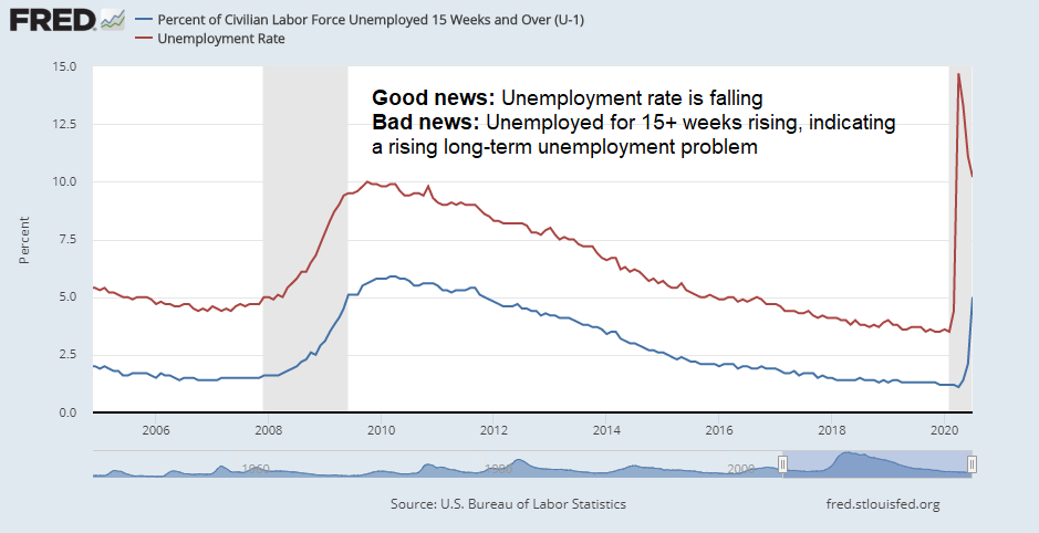 The story of Q2 earnings season has been a rapid climb in earnings and outlook, but the economy appears to be transitioning to a period of slower growth. The July Jobs Report was revealing in many ways. Even though some of the dire forecasts of negative jobs growth was averted and job growth came in at 1.8 million, which was slightly ahead of expectations, the trajectory of growth is slowing. Even though the unemployment rate fell, the unemployment rate for workers unemployed for 15 weeks or more continued to climb. This is an indication of a rising long-term unemployment problem.