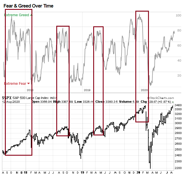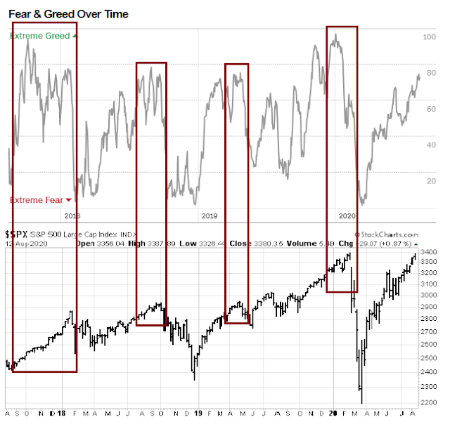 Mid-week market update: As the market tests resistance at the old highs, is sentiment greedy enough? The Fear and Greed Index stands at 73, and recently peaked at 75. While readings at these levels can indicate high risk environments, they have also been inexact market timing signals.
