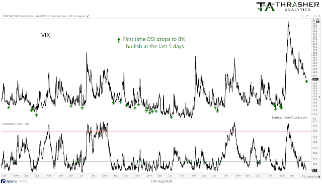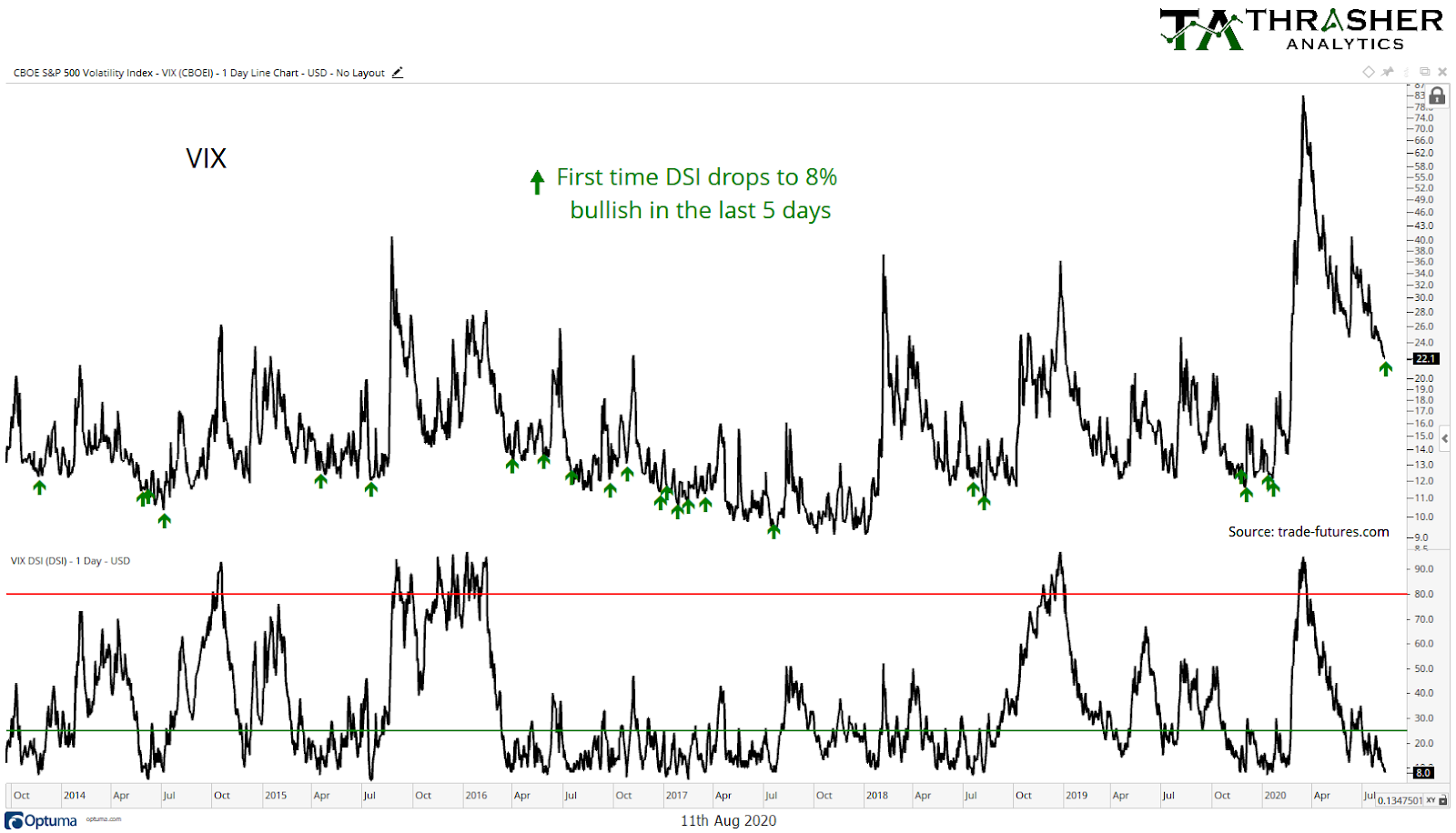 Andrew Thrasher pointed out that VIX sentiment has fallen below 10%, which is bullish for volatility and bearish for equities.