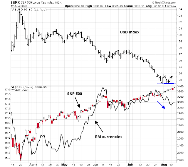 USD strength will create stress in the offshore dollar market, which negatively affects vulnerable EM economies and global risk appetite. The USD Index appears to have formed a double bottom and it is trying to rally. EM currencies are starting to show signs of weakness, which is not a good sign for equity prices.