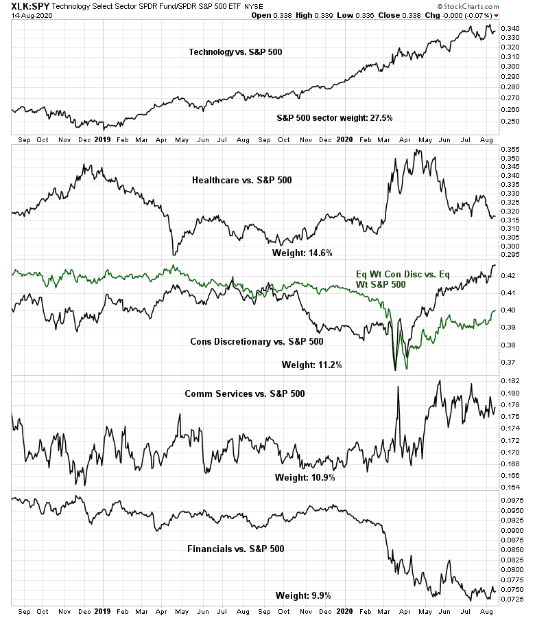How big and dominant is Big Tech? The chart below of the relative performance of the top five sectors in the S&P 500 tells the story. These five sectors comprise 74% of index weight, and it would be difficult for the market to significantly rise or fall without the participation of a majority. The weight of Big Tech sectors (technology, communication services, and consumer discretionary) make up about half of index weight. Consumer discretionary stocks is dominated by Amazon, and the chart shows the relative performance of equal-weighted consumer discretionary (in green), which minimizes the effect of heavyweights, as an illustration of how Amazon has dominated the sector. The equal weighted relative performance is far less impressive than its float weighted counterpart.