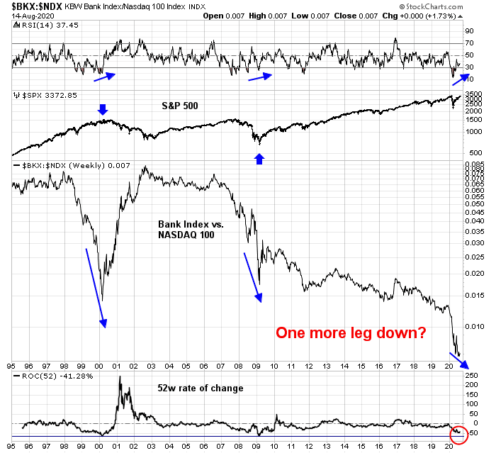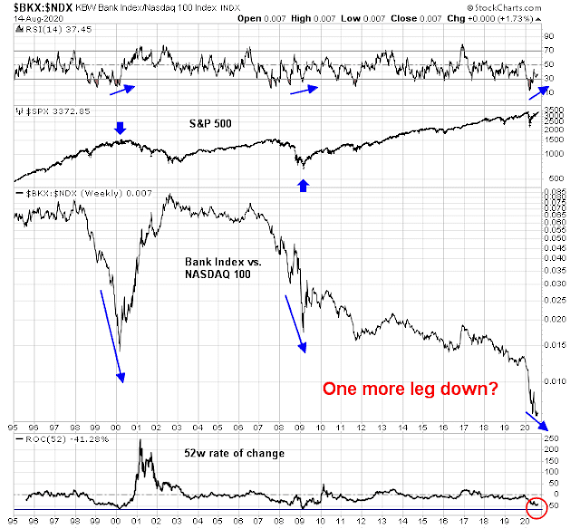A longer term way of thinking about the dominance of Big Tech is to measure the relative returns of banks, which represent an important component of the economy, to the NASDAQ 100. This is another way of measuring the value to growth performance ratio. Bank stocks have been beaten up so badly that they are overweight in most value indices, while the NASDAQ 100 is the poster child of growth. The Bank Index to NASDAQ 100 ratio has flashed a positive RSI divergence, which is bullish for banks and value stocks, but historically this ratio has not bottomed out until its annual relative performance nears -70%. This analysis suggests that there may be one final leg down for this ratio, and one final leg up for Big Tech.
