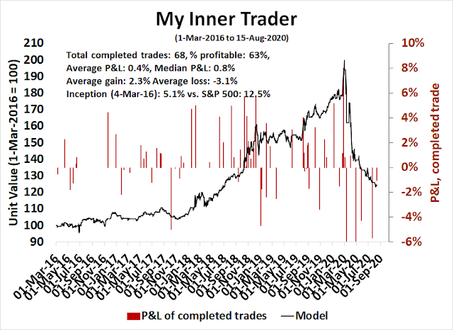 My inner trader uses a trading model, which is a blend of price momentum (is the Trend Model becoming more bullish, or bearish?) and overbought/oversold extremes (don’t buy if the trend is overbought, and vice versa). Subscribers receive real-time alerts of model changes, and a hypothetical trading record of the those email alerts are updated weekly here. The hypothetical trading record of the trading model of the real-time alerts that began in March 2016 is shown below.