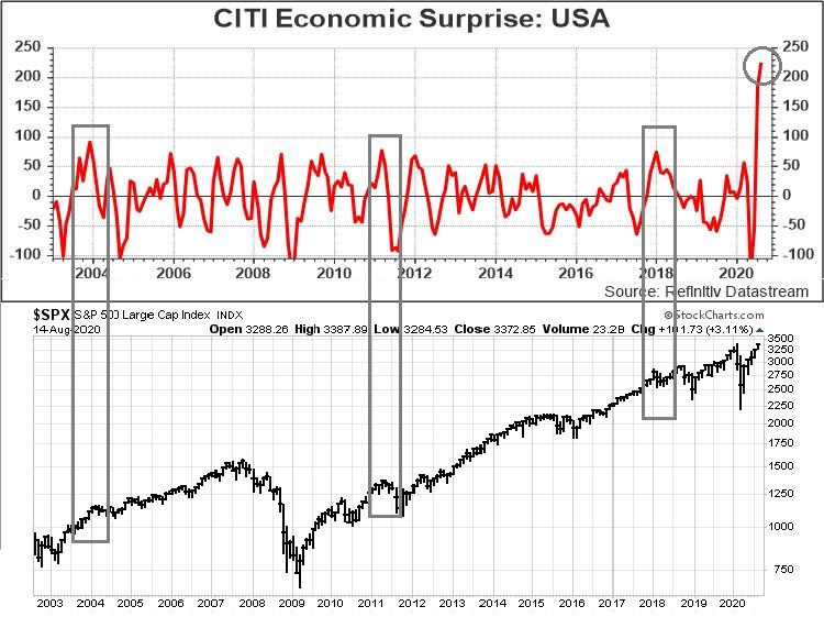 The narrative for the economy is turning from bounce back rebound to a stall. Historically, the stock market has encountered headwinds when growth expectations disappoint, as measured by the Citi Economic Surprise Index (ESI).