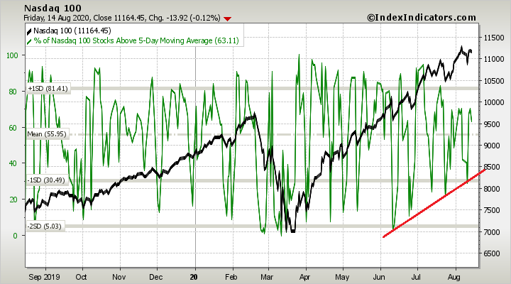 The NASDAQ 100 remains in an uptrend, though breadth indicators are sounding negative divergence warnings. Until the NASDAQ 100 breaks its trend line, it would be premature to turn bearish despite the widespread warnings.