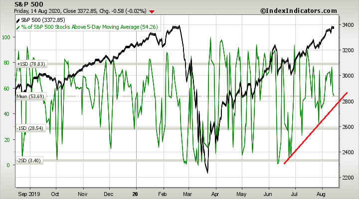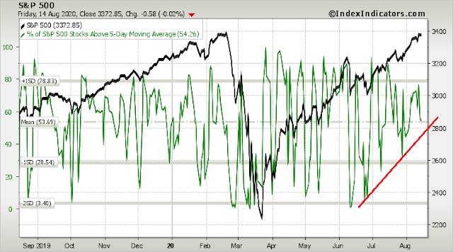 In the short run, none of this matters until the major market indices, and the NASDAQ 100 in particular, experience breaks to the rising trend lines. Short term momentum remains positive as the percentage of stocks in the S&P 500 above their 5 dma is exhibiting a series of higher lows.