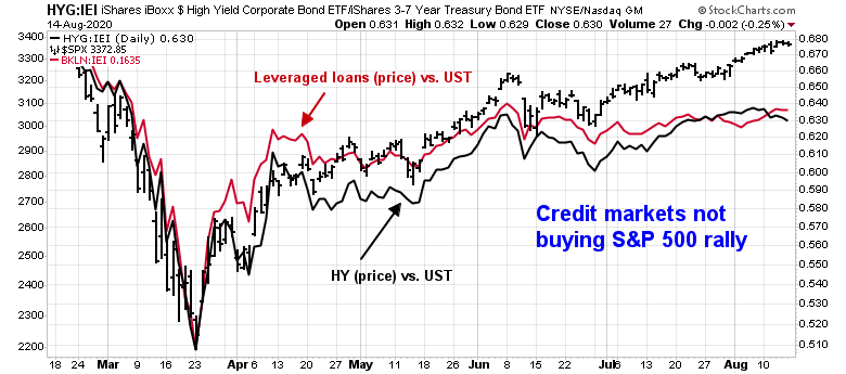 As well, credit market risk appetite, as measured by the relative performance of high yield (junk) bonds and leveraged loans to their duration equivalent Treasuries, are also not buying into the equity risk-on narrative.