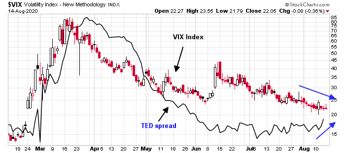 The divergence between the VIX Index and the TED spread, which is one of the credit market’s indication of risk appetite, is another worrisome sign.