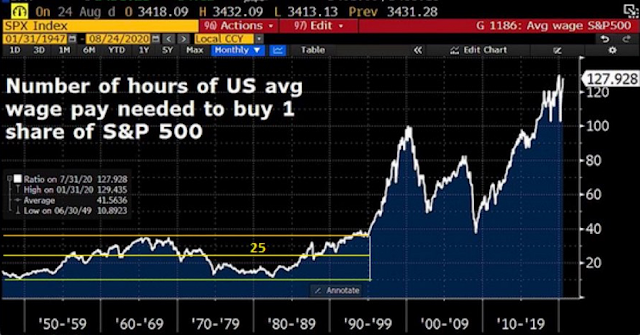 Another factor that is slowly gnawing away at the foundation of institutional respect is the growing inequality gap laid bare by the pandemic. For a perspective of the growing inequality between capital and labor, consider this chart of the number of hours an average worker needed to buy one share of the S&P 500. A gap opened in the mid-1990’s during the Clinton years, and continued through both Republican and Democratic presidencies.
