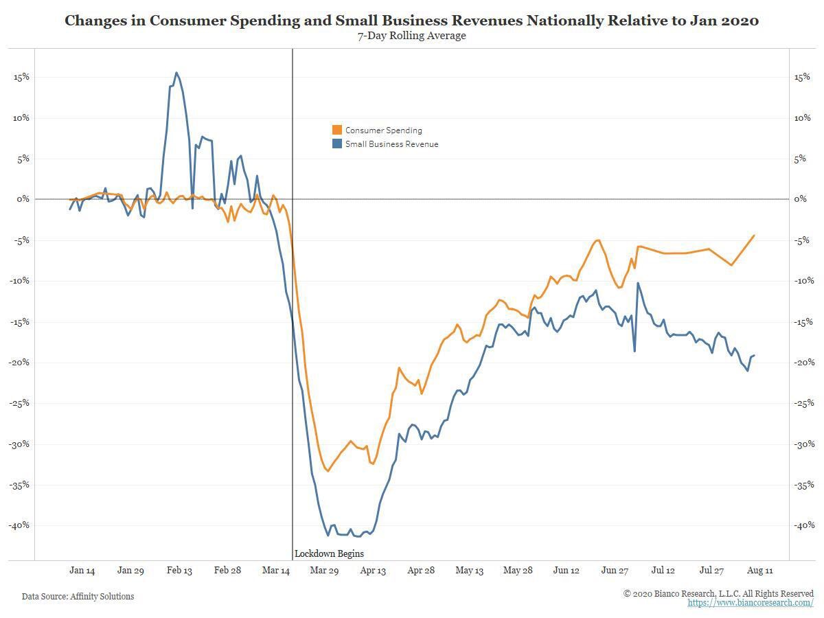Notwithstanding the simmering class war between the suppliers of capital and labor, the suppliers of capital are also experiencing a stratified inequality effect. Small businesses are bearing the brunt of the pandemic recession. High frequency data shows that consumer spending patterns have flattened out, but small business revenues is declining. The competitive advantages of corporate size and economies of scale are manifesting themselves, and the COVID Crash is increasing big business concentration at the expense of small businesses.