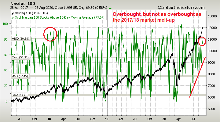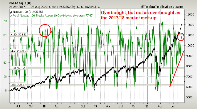 In the short run, the all important NASDAQ 100 is overbought, but levels are below the melt-up peak of early 2018. If the market is indeed undergoing a melt-up, it has room to rise further.
