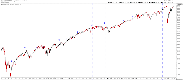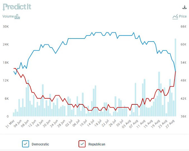 Next week will provide some clues to the Volmageddon vs. market melt-up question. That’s because the market may be overreacting to dovish comments from Fed chair Jay Powell last Thursday, and a post-convention polling bounce by the Republicans in the wake of their convention. While he is still trailing, the odds of a Trump electoral win has been improving at PredictIt.