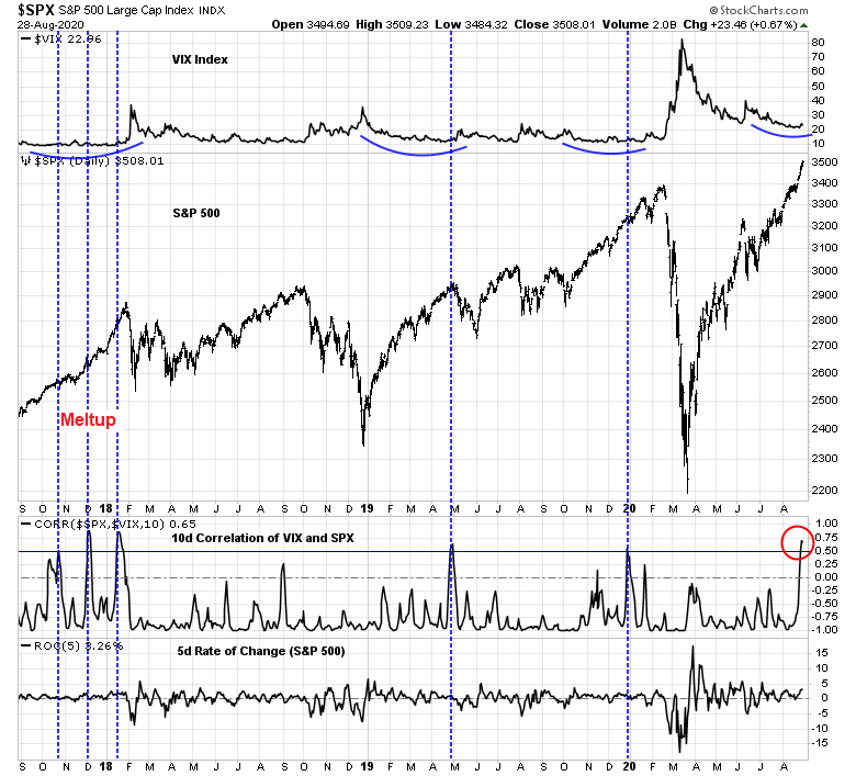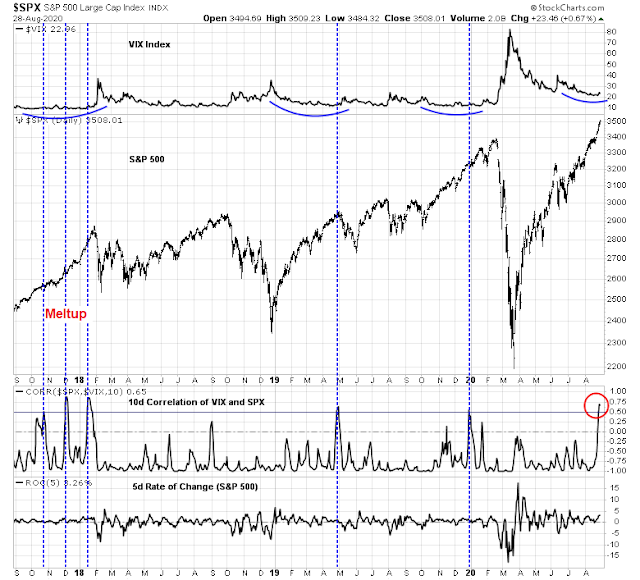 An unusual condition has occurred in the last week, as both stock prices and the VIX Index have been rising together. The VIX has been making a saucer bottom, which could be setting up for a volatility surge, and lower stock prices. While past episodes of high correlation have resolved in short or medium term pullbacks, there have been other occasions, such as late 2017, when these signals marked market melt-ups.