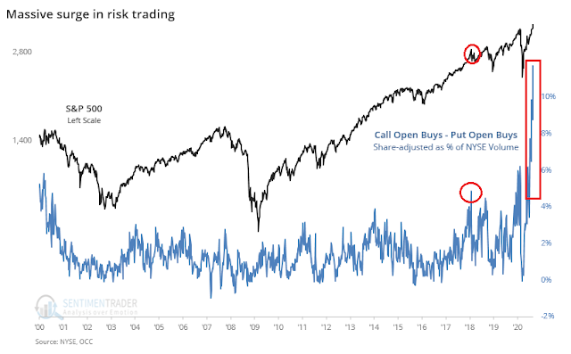 Sentiment is becoming stretched and overly bullish, which is contrarian bearish. SentimenTrader pointed out that call to put volume trading reached all-time highs last week, and conditions far exceeded the levels seen at the 2018 melt-up highs (annotations are mine). He characterized current conditions as a “combustible combo of musical chairs, Russian roulette, and five finger fillet”.
