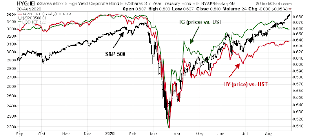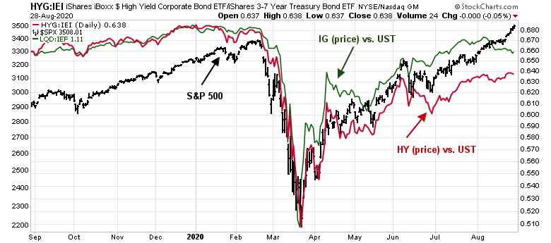 Let’s consider the evidence. There are plenty of warnings of an extended market. I have pointed out before how the price performance of high yield (junk) bonds relative to their duration-adjusted Treasury prices have not confirmed the stock market rally (red line). Now investment grade bonds (green line) are flashing a similar negative divergence. Credit market and stock market risk appetites are in disagreement. Usually, the bond market turns out to be right.
