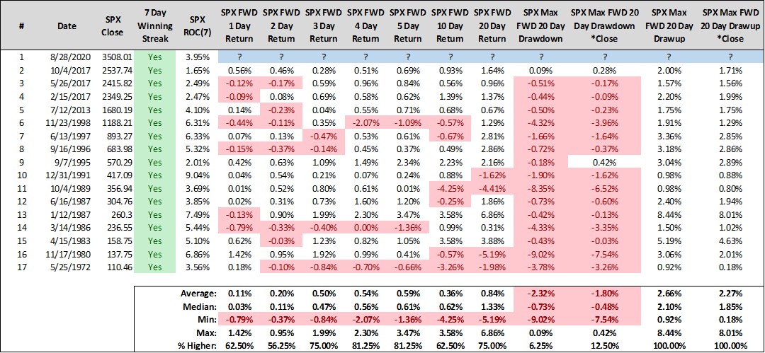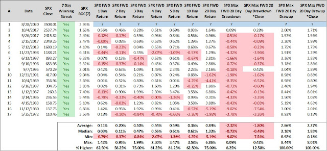 There are signs that the market is undergoing a momentum driven melt-up. The S&P 500 experienced a seven day winning streak, and Steve Deppe found that such winning streaks combined with all-time highs have tended to be bullish.