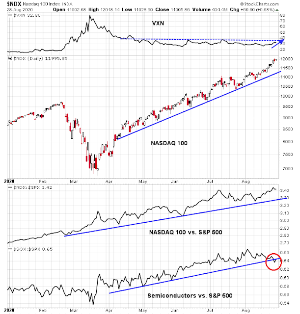 We are seeing some early warnings signs of a downside break. While the NASDAQ 100 is still behaving well, the relative performance of semiconductor stocks are showing some chinks in the Big Tech armor. Semiconductors have been on a tear for over a year, and their relative performance breached an uptrend last week, which I interpret as an early warning that not all is well. I will be watching whether VXN (top panel) can break out of resistance after forming a multi-month base.