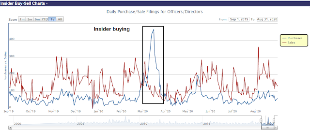 Other signals of market headwinds come from the behavior of the “smart money” crowd. One measure of “smart money” are corporate insiders, who have shown little tendency to step up and buy the shares of their companies. To be sure, insider trading works best mainly as a buy signal, when buying swamps selling as it did in March.