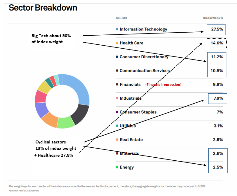 As a reminder, Big Tech comprises nearly 50% of S&P 500 weight, while the cyclical sectors are only 13% of the index. If and when we see a rotation from growth the value, financial stocks, which can be considered value stocks, are unlikely to participate significantly as long as the Fed suppresses interest rates and interest margins. While history doesn’t repeat, but rhymes, a leadership failure of US large cap growth will rhyme with the 2000 dot-com bubble top owing to the sheer differential in growth and value index weights.
