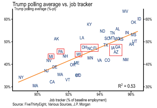 With Joe Biden ahead in the polls, the market is positioning for a loss by the incumbent, though we may get more clarity after next week’s debate. While the economy is not the only variable that affect voter intentions, this JPMorgan analysis shows a correlation between Trump support and employment levels, with key swing states highlighted. As the cyclical outlook weakens, this will creates headwinds for Trump.