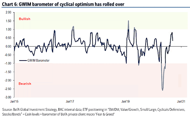 BoA reported that its private client holdings survey of cyclical optimism has peaked out and weakening.
