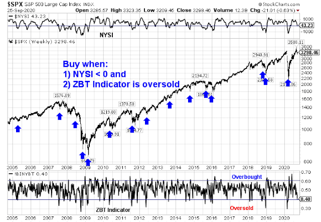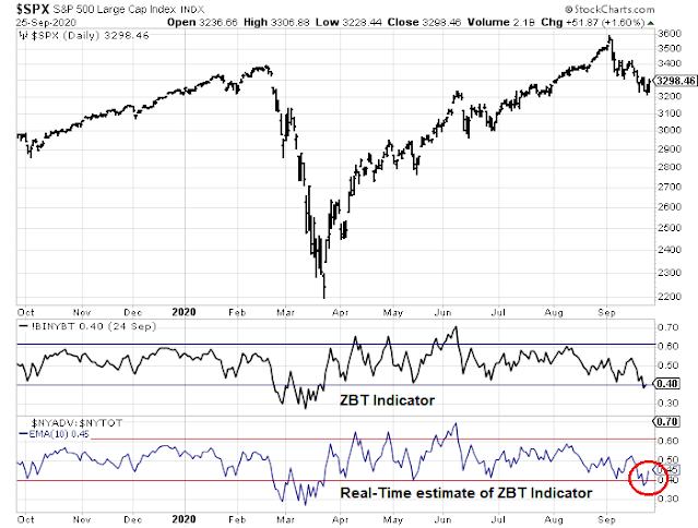 This indicator appears to be nearing a buy signal, but appearances can be deceiving. StockCharts reports the ZBT Indicator with a one-day delay, and I have created my own real-time estimate. Friday’s market rally lifted the ZBT Indicator off the oversold level. The ZBT Indicator is no longer oversold.