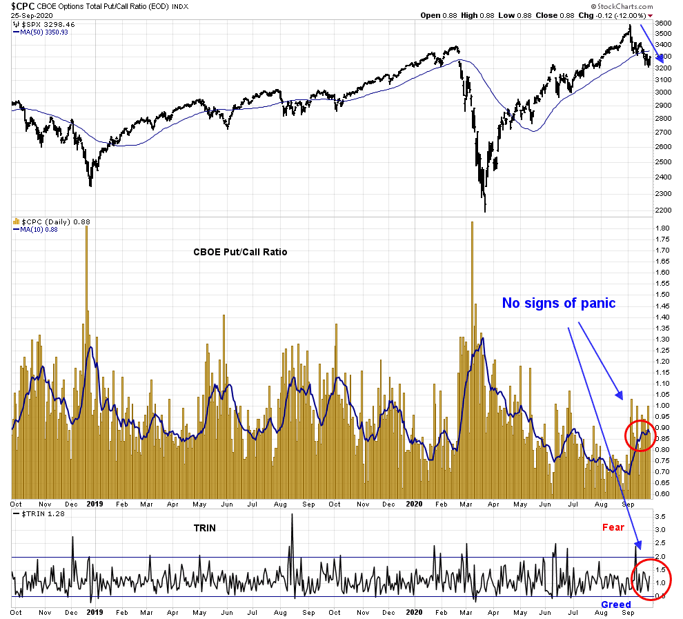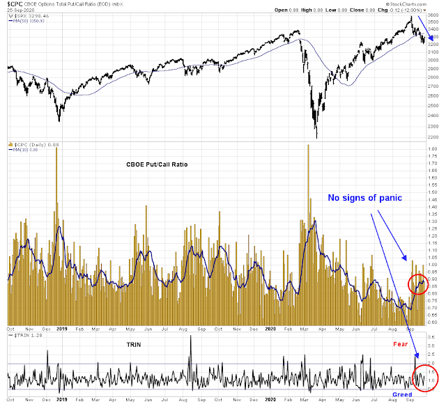 So where does that leave us today? So far, the market’s decline has been an orderly affair. Even though the S&P 500 is off about -10% off its highs in less than a month, there have been no signs of investor panic. The CBOE put/call ratio is still relatively low, indicating continued bullishness. In addition, there have been few TRIN spikes over 2, which are often indicative of price insensitive panic “margin clerk” selling that often occur at the end of major price declines.