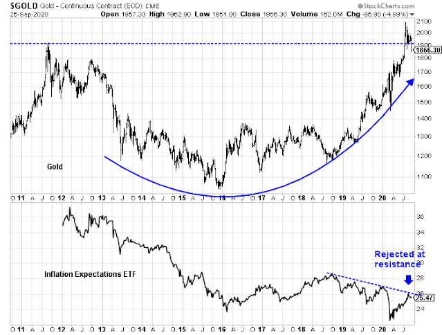 Arguably, USD strength is a sign that the market is growing concerned about the waning growth outlook. In addition, the appearance of a second pandemic wave in Europe has created doubts about the durability of a global cyclical rebound. Consequently, gold prices, which tend to be inversely correlated to the USD, have retreated below an important resistance turned support level, and the inflation expectations ETF was rejected at a falling trend line.