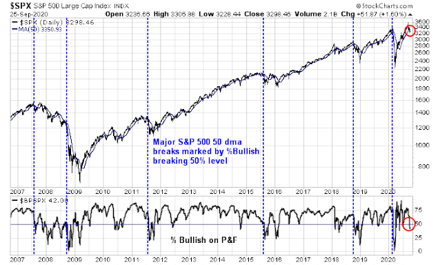 I agree. This retreat is acting like the start of a major pullback. The S&P 500 recently violated its 50 day moving average (dma). Past major pullbacks that began with 50 dma breaks were marked by the percent of S&P 500 bullish on point and figure charts plunging below 50%. To be sure, this does not assure us of a significant downturn, though it represents a sufficient though not necessary condition for one.