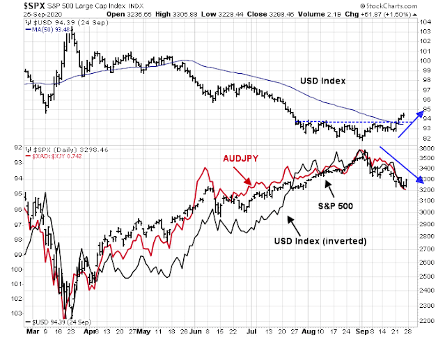 Equally worrisome is the strength of the USD Index. The USD has been inversely correlated with the S&P 500 since the March low. Moreover, the AUDJPY exchange rate, which is another key foreign exchange risk appetite indicator, is weakening.
