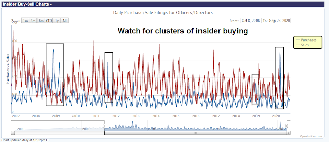 The first is insider buying. This group of “smart investors” have tended to be relatively prescient at market bottoms, though they can be early. Normally, insider selling swamps buying activity. I would look for clusters of insider buying that exceed selling.