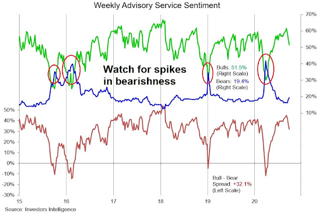 The second class of bottom spotting indicators is investor sentiment. Sentiment surveys, such as Investors Intelligence, have generally not recycled to a bearish extreme. While the recent decline in bullishness is constructive, I would like to see bearish sentiment soar. In the past, durable market bottoms have not been formed without a spike in bearishness.